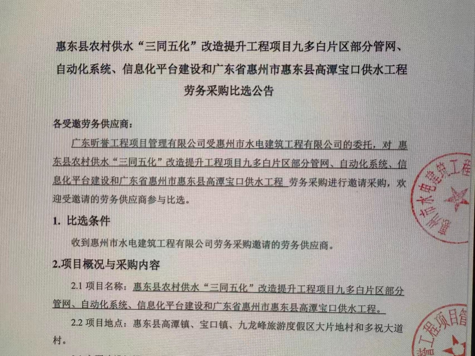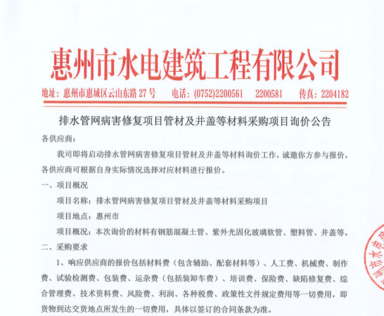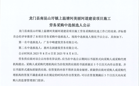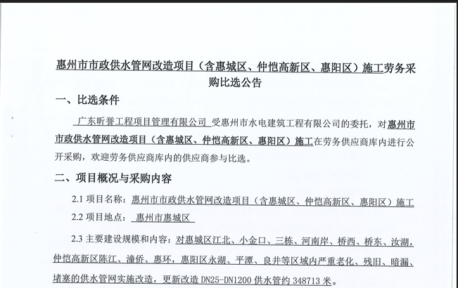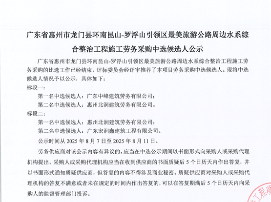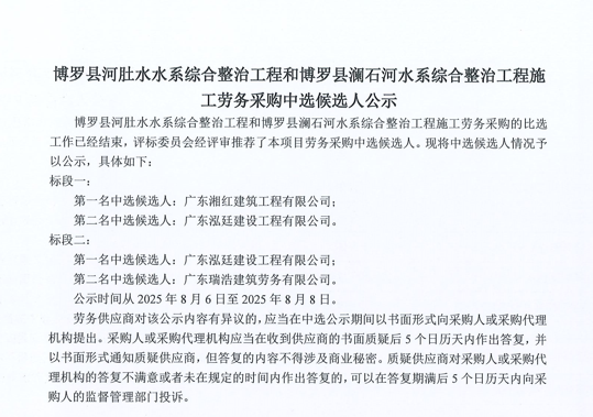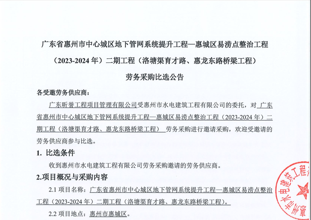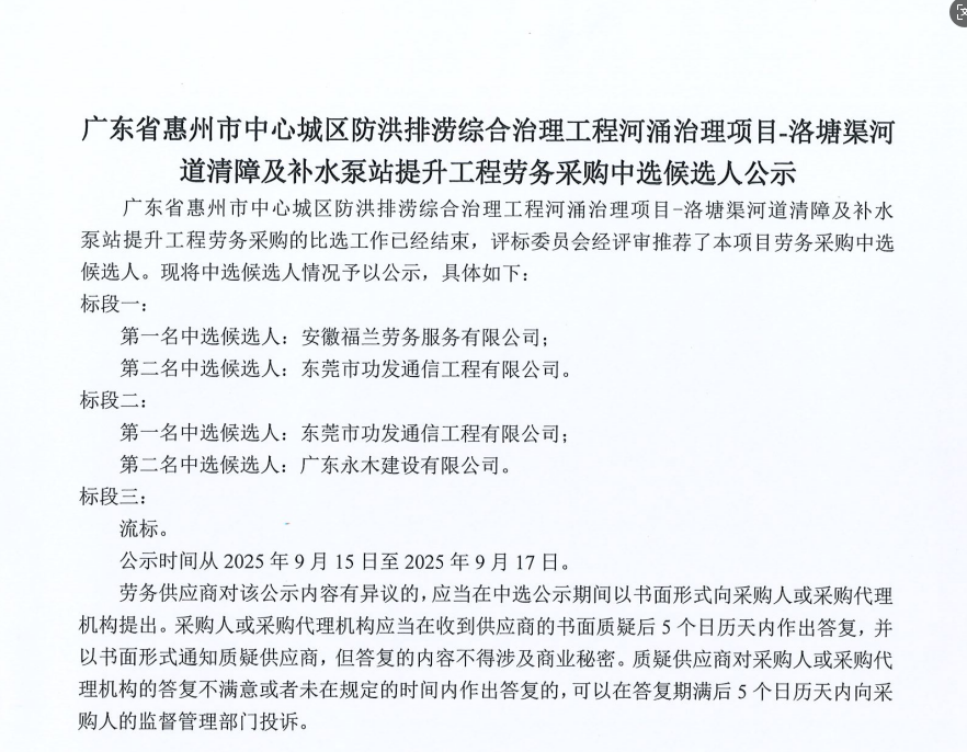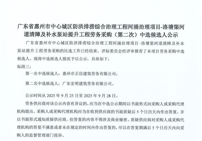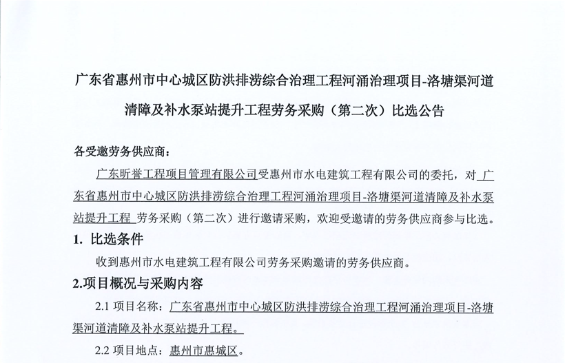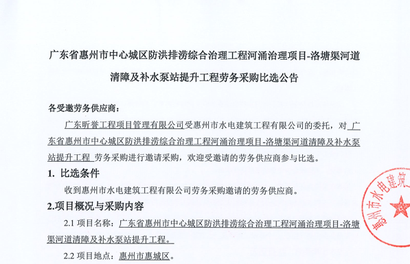 惠州市增江龍門段治理工程施工(一標(biāo)段)勞務(wù)采購比選公告……