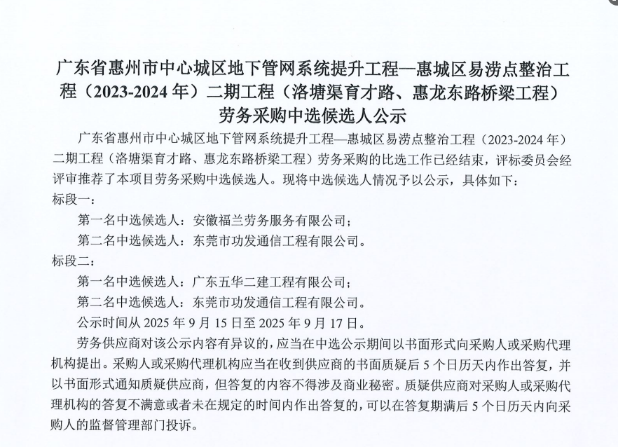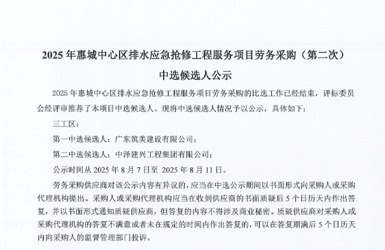 惠州市水電建筑工程有限公司勞務(wù)供應(yīng)商庫擴(kuò)庫評審結(jié)果公示……